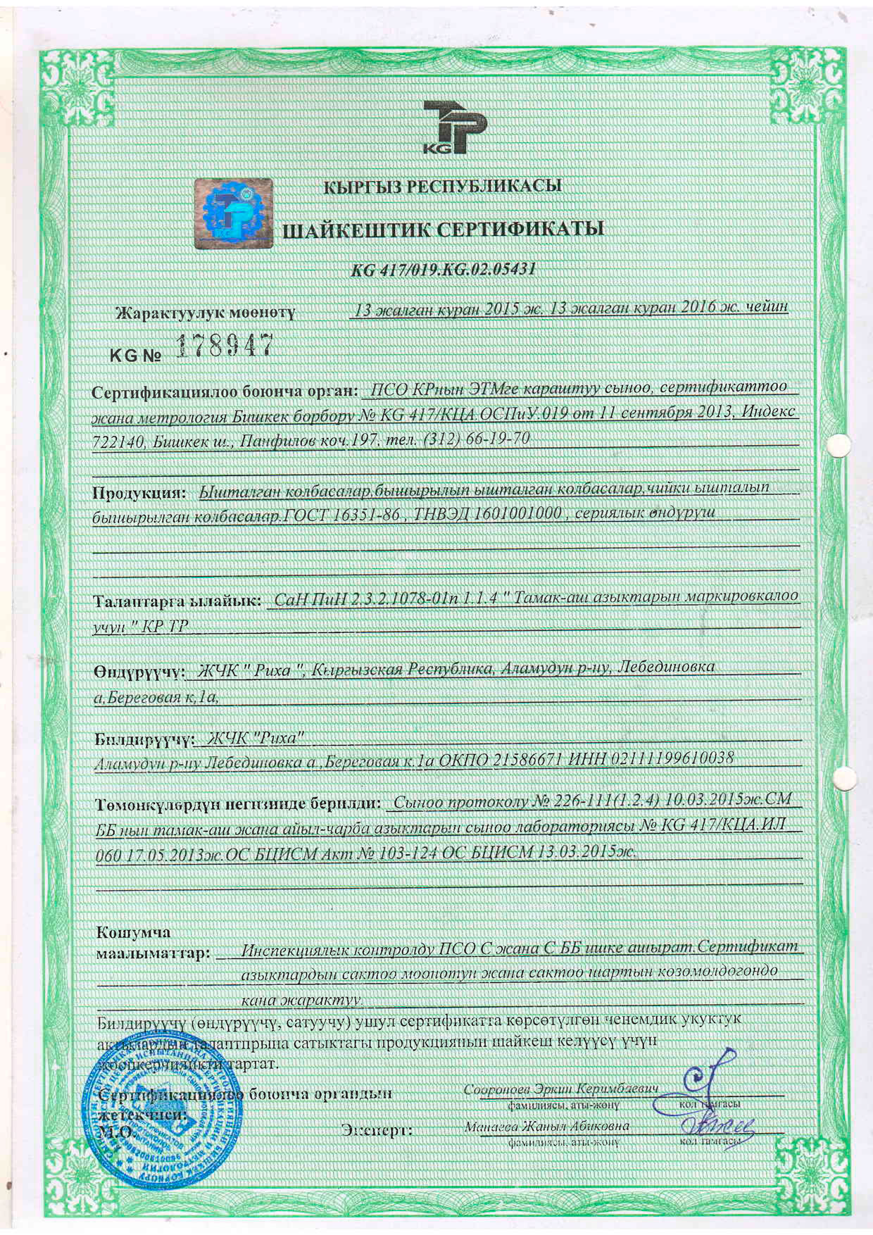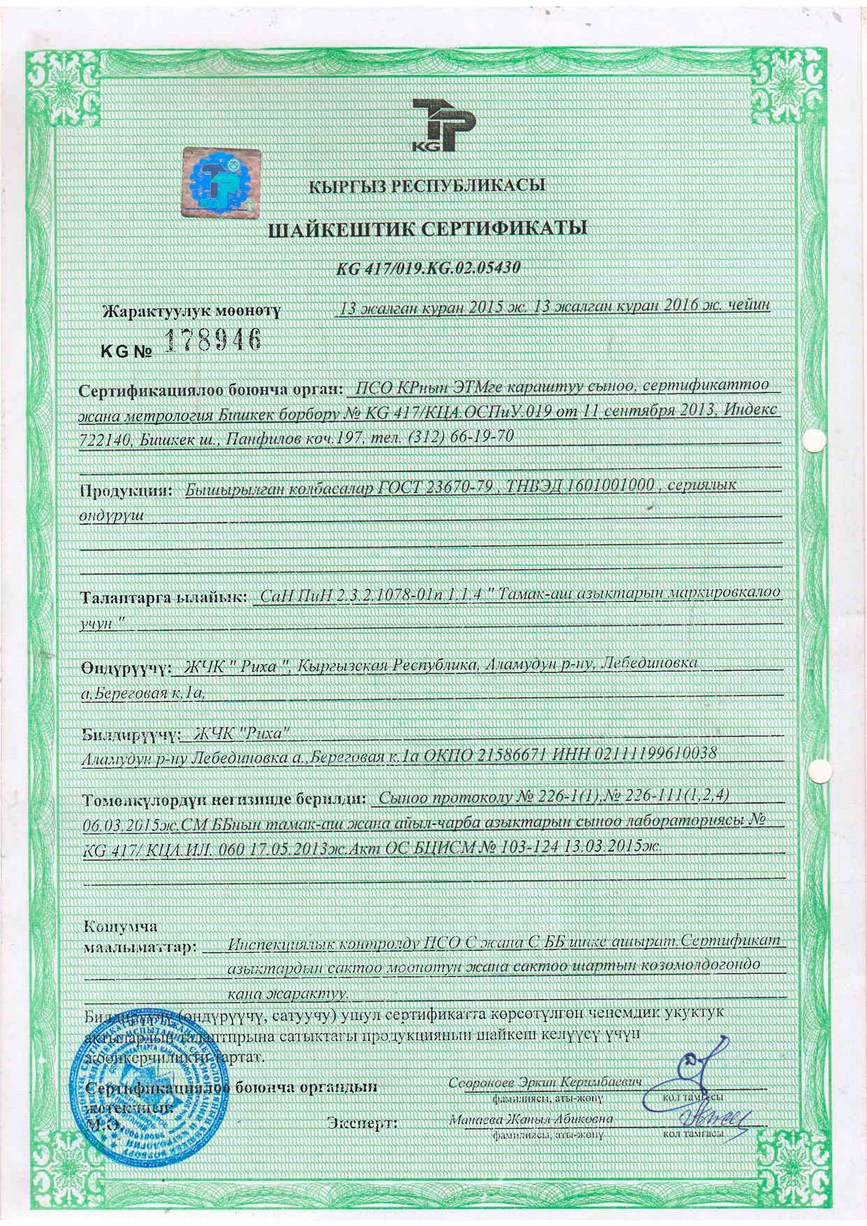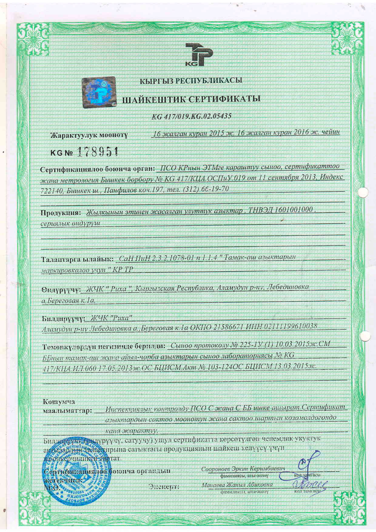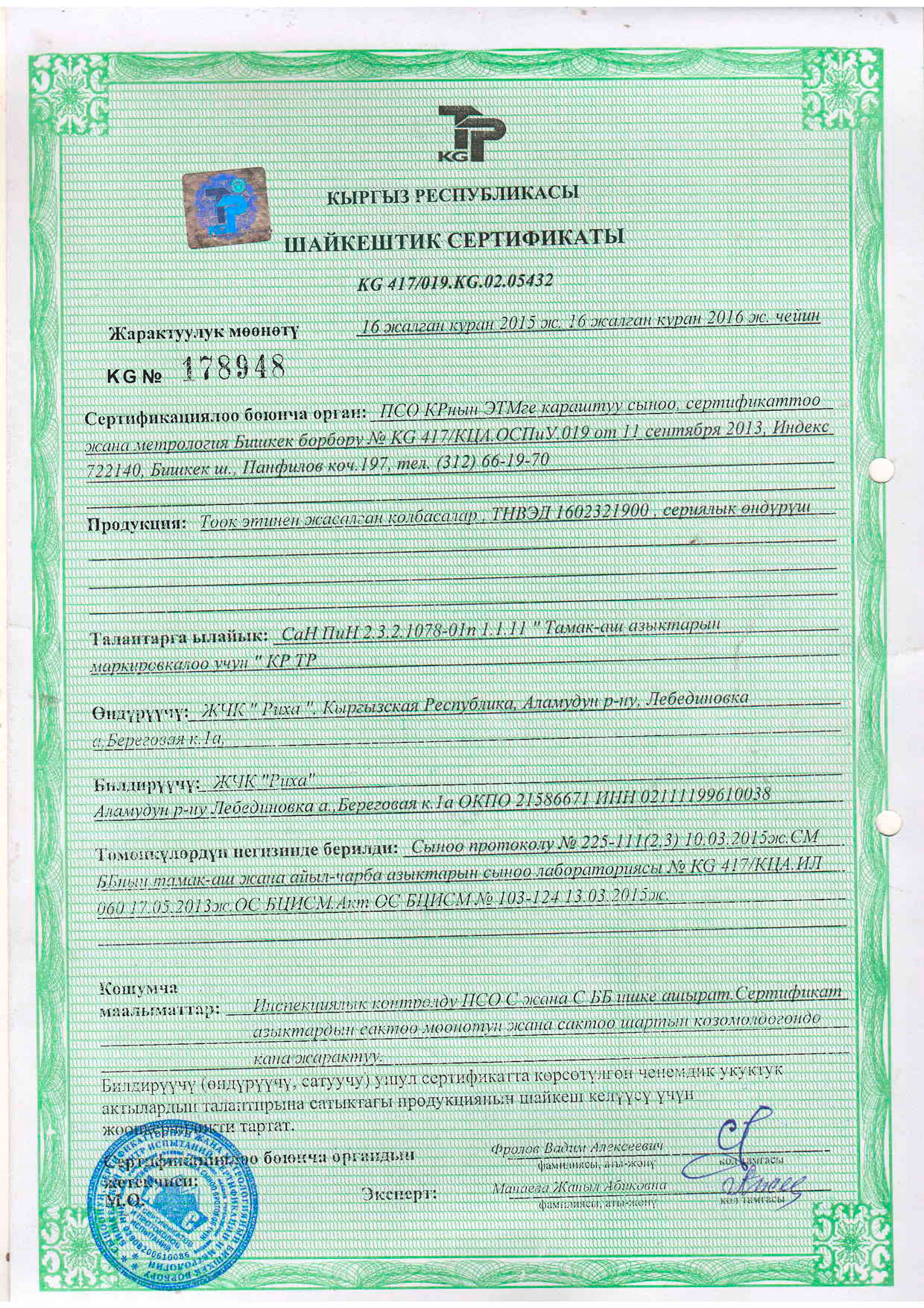 Компаниянын башкы директору катары мен тамак-аш азыктарынын сапаты жана коопсуздугу жаатындагы саясатты жактайм. Бул принциптердин ийгиликтүү ишке ашырылышы үчүн жоопкерчилик Компаниянын бардык деңгээлдериндеги жана бардык бөлүмдөрүндөгү ар бир кызматкерге жүктөлөт.